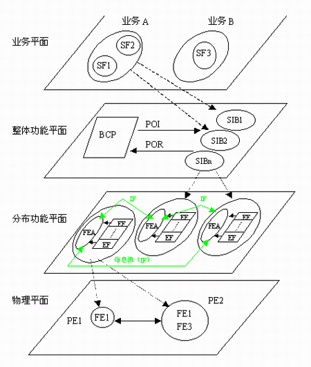 在上圖1中, SF—業(yè)務(wù)屬性;BCP—基本呼叫處理;SIB—業(yè)務(wù)無關(guān)構(gòu)筑塊;FE—功能實體; FEA—功能實體動作;FE—物理實體;POI—起始點;