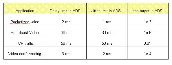 本節(jié)以ADSL承載的幾種典型業(yè)務(wù)為例,討論如何保證不同應(yīng)用的QoS要求。為保證不同應(yīng)用的QoS要求,ADSL設(shè)備可通過對(duì)不同的業(yè)務(wù)進(jìn)行分級(jí),以Diffserv的方式提供不同的分級(jí)所需的QoS質(zhì)量。例如可將語音業(yè)務(wù)(VoIP)和視頻會(huì)議設(shè)為最高優(yōu)先級(jí),廣播視頻業(yè)務(wù)設(shè)為較高優(yōu)先級(jí),其他如Web瀏覽等業(yè)務(wù)設(shè)為低優(yōu)先級(jí)。ADSL設(shè)備為每個(gè)優(yōu)先級(jí)設(shè)立獨(dú)立的隊(duì)列,然后采用嚴(yán)格優(yōu)先級(jí)或帶有權(quán)重的循環(huán)機(jī)制控制各優(yōu)先級(jí)隊(duì)列的輸出。通過調(diào)整不同優(yōu)先級(jí)隊(duì)列的buffer大小和最長(zhǎng)留駐時(shí)間,可滿足不同應(yīng)用對(duì)時(shí)延、抖動(dòng)、包丟失率的不同要求。