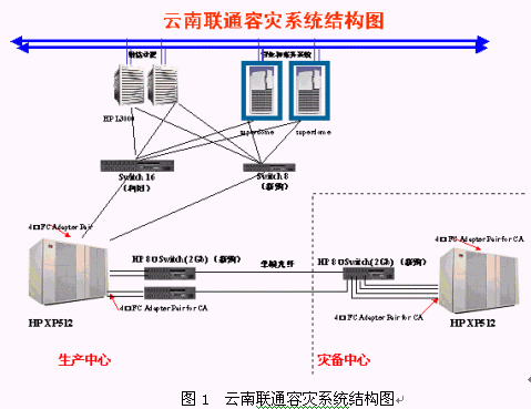 本期工程采用了HP高端磁盤陣列XP512進行遠程數(shù)據(jù)容災(zāi),在云南聯(lián)通業(yè)務(wù)中心本地新增一臺HP XP512。同時,在異地備份中心新增一臺XP512存儲服務(wù)器,作為主生產(chǎn)中心XP512的異地容災(zāi)備份。本次容災(zāi)的建設(shè)目標(biāo)是對綜合營帳系統(tǒng)、專業(yè)計費、短消息計費系統(tǒng)進行同城異地數(shù)據(jù)級容災(zāi)的綜合數(shù)據(jù)容災(zāi)系統(tǒng),業(yè)務(wù)系統(tǒng)的數(shù)據(jù)將可以通過基于XP磁盤陣列的Continuous Access XP軟件實時同步復(fù)制到備份數(shù)據(jù)中心的XP512中,從而實現(xiàn)數(shù)據(jù)的遠程保護