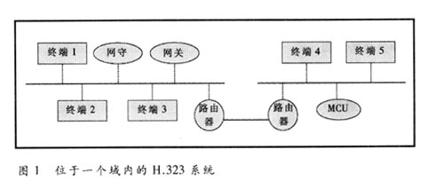 一個簡單的基于H.323的視訊會議系統(tǒng)包括網(wǎng)守(GK)、網(wǎng)關(guān)(GW)、多點控制單元(MCU)和所有終端的集合。圖1是在常見的一種域類型中的H.323系統(tǒng)。