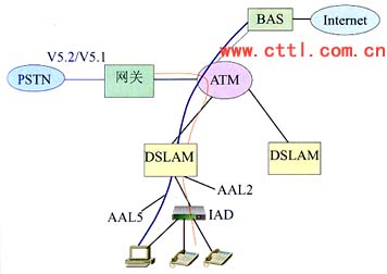 DSL的IAD與VoATMover DSL的類似,可以提供多路POTS或者ISDN接口、以太網(wǎng)接口,上行可以是ADSL或者G.shdsl接口、VDSL接口,直接接入DSLAM。不同的是,IAD與網(wǎng)關(guān)之間傳輸分組語音數(shù)據(jù),IAD需要配置相應(yīng)的IP地址。網(wǎng)關(guān)提供E1接口通過V5.2或者V5.1協(xié)議接入到PSTN網(wǎng)。與第一種方案不同的是,DSLAM不需要支持AAL2信元的識(shí)別,這里的DSLAM可以是ATMDSLAM或者是IP