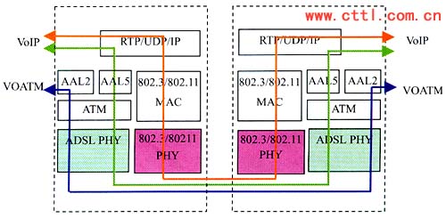 VoATM over DSL是基于ATM技術(shù)提供話音業(yè)務(wù),話音業(yè)務(wù)和數(shù)據(jù)業(yè)務(wù)分別通過AAL2和AAL5進(jìn)行封裝。AAL2技術(shù)是專為在ATM網(wǎng)絡(luò)上傳輸語音而設(shè)計(jì)的,在分組語音數(shù)據(jù)的封裝處理、多個(gè)分組語音數(shù)據(jù)如何在一條VC上傳送等有著嚴(yán)格的定義,它不需要為IAD配置IP地址。因此,VoATM是一種在ATM數(shù)據(jù)網(wǎng)上提供語音的解決方案,語音業(yè)務(wù)必須在AAL2信元中傳輸,只能應(yīng)用于ATM網(wǎng)絡(luò),不能應(yīng)用于以IP網(wǎng)絡(luò)為主的數(shù)據(jù)網(wǎng)。