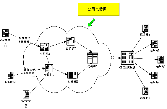 - CTI系統(tǒng)的將以企業(yè)(B)的名義對(duì)客戶(hù)(A)進(jìn)行接續(xù)服務(wù),該服務(wù)可以是語(yǔ)音服務(wù),傳真服務(wù),人工服務(wù),可以是客戶(hù)定制的語(yǔ)音系統(tǒng),傳真服務(wù)系統(tǒng),會(huì)議系統(tǒng),技術(shù)支持系統(tǒng)等等。