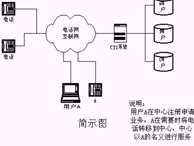 該業(yè)務(wù)方法涉及一種用戶(hù)電話轉(zhuǎn)移到CTI(Computer Telephony Integration)語(yǔ)音服務(wù)系統(tǒng)的接續(xù)服務(wù)方法,其CTI系統(tǒng)通過(guò)接口連接于公用電話網(wǎng),用戶(hù)在CTI系統(tǒng)登記,選擇服務(wù)功能,相關(guān)信息存入數(shù)據(jù)庫(kù),用戶(hù)電話設(shè)置轉(zhuǎn)移;當(dāng)客戶(hù)呼叫已轉(zhuǎn)移用戶(hù)電話時(shí),自動(dòng)接入CTI語(yǔ)音系統(tǒng),請(qǐng)求相關(guān)信息,對(duì)信息進(jìn)行分析判斷、處理,查詢(xún)數(shù)據(jù)庫(kù)用戶(hù)信息,以用戶(hù)名義進(jìn)行接續(xù)服務(wù)。其完全避免了傳統(tǒng)CTI系統(tǒng)的專(zhuān)用特服號(hào)碼服務(wù)的弊端,充分利用了交換機(jī)的功能,以用戶(hù)的電話號(hào)碼為客戶(hù)提供語(yǔ)音、傳真、數(shù)據(jù)及人工接續(xù)服務(wù)。