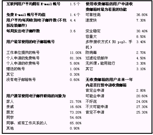 根據(jù)中國互聯(lián)網(wǎng)信息中心的調(diào)查顯示,中國現(xiàn)有9400萬互聯(lián)網(wǎng)用戶, 用戶最經(jīng)常使用的網(wǎng)絡(luò)服務(wù)和功能是電子郵箱:占85.6%。
