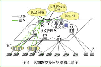 隨著PSTN用戶(hù)逐步轉(zhuǎn)變?yōu)檐浗粨Q網(wǎng)絡(luò)用戶(hù),未來(lái)以軟交換網(wǎng)絡(luò)為核心、PSTN端局作為接入的網(wǎng)絡(luò)結(jié)構(gòu)將逐步形成。如圖4所示,軟交換網(wǎng)絡(luò)將覆蓋包括PSTN用戶(hù)在內(nèi)的各種類(lèi)型的用戶(hù)終端,具有SSP功能,提供智能網(wǎng)業(yè)務(wù);具備大容量關(guān)口局功能,實(shí)現(xiàn)與其他運(yùn)營(yíng)商網(wǎng)絡(luò)的互通。