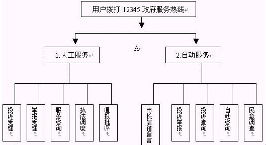 當(dāng)用戶撥通"12345"電話并選擇自動服務(wù)時,聲訊臺自動播放引導(dǎo)語"選擇市長信箱留言請按1,自動投訴舉報請按2,投訴查詢請按3,服務(wù)咨詢請按4,民意調(diào)查請按5。