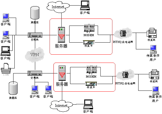 上圖中紅色框架為gotoneFax系統(tǒng)。它可以很方便的融入目前企業(yè)的網(wǎng)絡(luò)中,擴張您目前網(wǎng)絡(luò)的功能,為您提供及時的服務(wù)。當(dāng)然這也是我們的愿望。