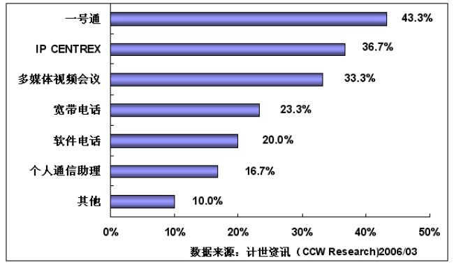 通過計世資訊(CCW Research)的調(diào)研可以看到,行業(yè)用戶對一號通、IP-CENTREX、多媒體視頻會議和寬帶電話等基于NGN平臺開發(fā)的業(yè)務(wù)比較感興趣,其中:對一號通感興趣的用戶達(dá)到43.3%,對IP-CENTREX感興趣的用戶為36.7%,對多媒體視頻會議感興趣的用戶達(dá)到33.3%,對寬帶電話感興趣的用戶達(dá)到23.3%,對軟件電話感興趣的用戶達(dá)到20.0%,對個人通信助理感興趣的用戶達(dá)到16.7%。