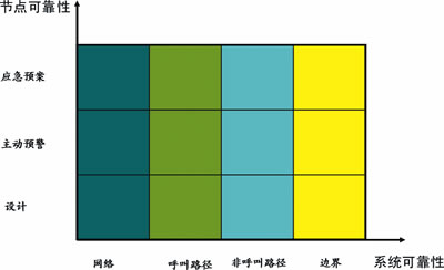 呼叫中心可靠性模型的每個(gè)維度都有一些設(shè)備/軟件節(jié)點(diǎn)組成,每個(gè)維度的可靠性需要通過(guò)組成節(jié)點(diǎn)以及節(jié)點(diǎn)之間鏈路的可靠性來(lái)實(shí)現(xiàn),節(jié)點(diǎn)可靠性的實(shí)現(xiàn)可以抽象為3個(gè)層次:設(shè)計(jì)可靠性、主動(dòng)預(yù)警能力和應(yīng)急預(yù)案。通過(guò)對(duì)所有節(jié)點(diǎn)3個(gè)層次的可靠性分析,可以實(shí)現(xiàn)可靠性模型每個(gè)維度的可靠性,從而實(shí)現(xiàn)系統(tǒng)可靠性。根據(jù)圖2的可靠性分析矩陣,可以建立呼叫中心可靠性分析方法。