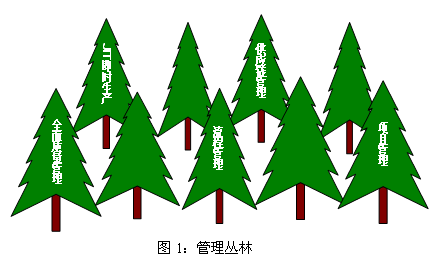 用“叢林”一詞來形容目前管理方法的林立,并沒有夸張的成份。在這片叢林中,許許多多根深葉茂的“參天大樹”不斷產(chǎn)生。許多專家學(xué)者把注意力集中于管理的某一方面,如質(zhì)量管理、流程再造、項目管理、供應(yīng)鏈管理等都體現(xiàn)了不同的管理視角。不同管理方法在理論緣由上相互促進、相互影響,他們以各自不同的方式和視角描繪了管理的不同側(cè)面。