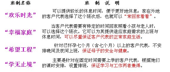 通過(guò)流程優(yōu)化,可以大大提高組織的運(yùn)營(yíng)效率和工作質(zhì)量,如:我們通過(guò)對(duì)員工排班流程的優(yōu)化,大大提高了客戶服務(wù)中心人員的利用效率、服務(wù)質(zhì)量,同時(shí),還提高了員工滿意度。我們通過(guò)對(duì)流程中第3、4、5步工作方法的改進(jìn),大大提高了人員利用率,且提高幅度達(dá)20%以上。同樣,通過(guò)對(duì)第6步班次設(shè)置的改進(jìn),實(shí)施了個(gè)性化的班次設(shè)置(見(jiàn)表2),如:針對(duì)喜歡有整天休息時(shí)間,及家在外地的客戶代表,設(shè)置了“歡樂(lè)時(shí)光”輪班,為大家提供較長(zhǎng)的休息時(shí)間,如兩天以上的連休,便于回家與更好地休息;針對(duì)家里有小孩子或老人、需在固定時(shí)間回家的客戶代表,設(shè)置了“幸福家庭”輪班,為他們提供適應(yīng)家庭需求的上班與休息時(shí)間,盡量保證員工的正常家庭生活;針對(duì)已懷孕及哺乳期的客戶代表,設(shè)置了“希望工程”輪班,不安排晚間及夜間上班,保證了母子的安全與健康;針對(duì)在固定時(shí)間需要上學(xué)的客戶代表,設(shè)置了“學(xué)無(wú)止境”輪班,主要是根據(jù)她們的課時(shí)安排設(shè)置排班,保證學(xué)習(xí)與工作兩者兼得。這種做法大大加強(qiáng)了員工積極性,并提高了員工的滿意度。