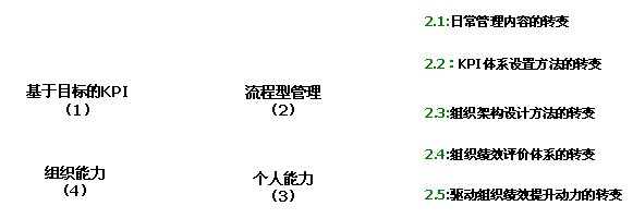 如圖1中的第(1)部分所示,客戶服務(wù)中心原來的管理是基于目標KPI的管理,為了有效實施“流程型”管理,必須將其轉(zhuǎn)變“流程型”管理的組織,即必須將原來基于目標的KPI管理轉(zhuǎn)變?yōu)榛诹鞒痰腒PI管理和流程(過程)管理(如圖1中的第(2)部分所示)。同時,通過對員工培訓(xùn)組織所具有的一流的流程,使員工按照流程能力產(chǎn)生一流的績效,實現(xiàn)組織向員工的能力傳遞,有效提高每個員工的個體能力(如圖1中的第(3)部分所示);通過統(tǒng)一規(guī)范的流程保證個體行為的一致性,從而保證組織的能力,從而推動整個團隊組織能力的提升(如圖1中的第(4)部分所示),最終通過組織能力保證組織目標績效的實現(xiàn)(如圖1中的第(1)部分所示)。