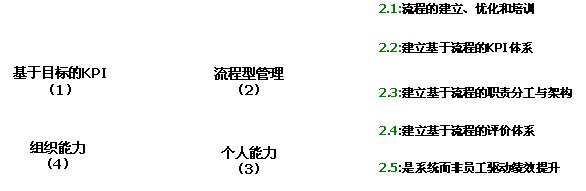 因此,要有效實(shí)施“流程型”管理,必須在我們?nèi)粘9芾淼膬?nèi)容、KPI體系、組織架構(gòu)、績效評價體系和組織發(fā)展的驅(qū)動力五個方法實(shí)施同步的轉(zhuǎn)變,才能有效建立流程文化,保證整個組織對流程的理解和重視,提高組織的執(zhí)行能力,通過“組織能力”保證組織目標(biāo)的實(shí)現(xiàn),而非依賴個體能力。