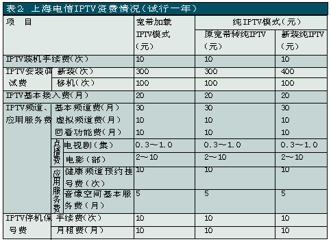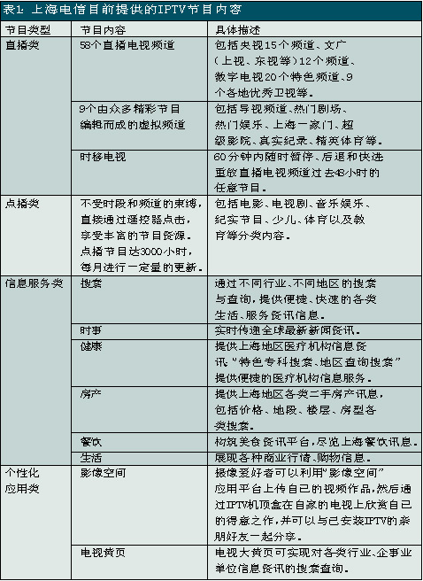 上海電信是國內(nèi)關(guān)注并切入IPTV業(yè)務較早的電信運營商之一,自2005年就開始積極測試和試驗。此次上海電信在全上海市范圍內(nèi)推出IPTV業(yè)務,被業(yè)界看作是“中國IPTV規(guī)模商用的新紀元”。除了影視節(jié)目收看、視頻內(nèi)容點播、時移功能外,上海電信的IPTV服務還包括時事新聞、遠程醫(yī)療、視頻房產(chǎn)信息、餐飲信息、天氣預報、票務查詢等信息服務以及可視電話、IPTV游戲等個性化應用。其中IPTV的直播頻道有58個,視頻點播可選節(jié)目量達3000小時以上。另外,上海電信還推出了影像空間和電視大黃頁等應用服務,攝像愛好者可以利用“影像空間”應用平臺上傳自己的視頻作品,然后通過IPTV機頂盒在自家的電視上欣賞自己的得意之作,并可以與已安裝IPTV的親朋好友一起分享;電視大黃頁可實現(xiàn)對各類行業(yè)、企事業(yè)單位信息資訊的搜索查詢。