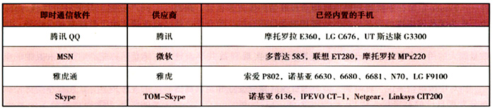 手機(jī)廠商、服務(wù)和內(nèi)容提供商都非?春靡苿(dòng)即時(shí)通信市場(chǎng),已經(jīng)有大量的手機(jī)內(nèi)置了主流的即時(shí)通信軟件,例如采用Windows Mobile系列操作系統(tǒng)的智能手機(jī)都預(yù)置了MSN。雅虎、騰訊在推動(dòng)其“移動(dòng)QQ”業(yè)務(wù)時(shí),也努力說(shuō)服手機(jī)廠商內(nèi)置其軟件。內(nèi)置即時(shí)通信軟件的手機(jī)型號(hào)如表l所示。