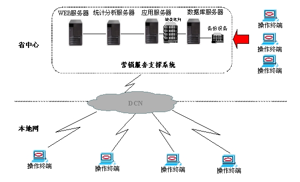 省中心/分公司營銷服務支撐系統(tǒng)由兩臺IBM服務器形成雙機集群,同時安裝有數(shù)據(jù)庫服務器、WEB服務器、應用服務器、統(tǒng)計分析服務器。
