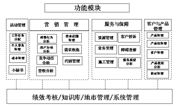 本系統(tǒng)主要有客戶與產品管理、營銷管理、服務與保障、活動管理、績效考核五大主要功能,如下圖所示。