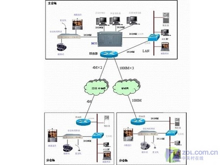 上面是一個基于H.323協(xié)議的典型視頻會議系統(tǒng)組網(wǎng)方案。由于基于H.323的視頻會議系統(tǒng)在物理線路上是允許與數(shù)據(jù)網(wǎng)絡(luò)共用的,所以上面的組網(wǎng)方案中還包括了數(shù)據(jù)網(wǎng)絡(luò)的部分。