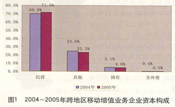 電信增值市場的開放和政策環(huán)境的優(yōu)化,也吸引了眾多的外資企業(yè)。電信增值服務(wù)的投資來源、經(jīng)營主體、服務(wù)目標(biāo)、經(jīng)濟(jì)功能與基礎(chǔ)電信業(yè)務(wù)存在明顯差異,彼此間有競爭關(guān)系,但更多的是補(bǔ)充、豐富的關(guān)系。目前,我國已放開電信增值市場準(zhǔn)入,從2005年起,整個電信增值業(yè)務(wù)市場就呈現(xiàn)出持續(xù)快速發(fā)展的勢頭,民營資本已經(jīng)發(fā)展成為電信增值業(yè)務(wù)領(lǐng)域的主力軍,其所占企業(yè)數(shù)量比例已超過70%(見圖1)。