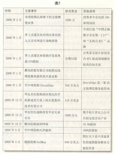 從2003年開始,國內(nèi)就顯現(xiàn)出并購增值服務(wù)運(yùn)營企業(yè)的苗頭。2004年以來,隨著整治增值服務(wù)運(yùn)營企業(yè)的力度不斷加大,并購漸成風(fēng)潮(見表1)。2004年2月,新浪收購深圳網(wǎng)興科技公司;2004年5月,搜狐收購手機(jī)WAP服務(wù)提供商北京吉菲爾公司。2005年,在“超級女生”節(jié)目大獲成功后,掌上靈通宣布將對國內(nèi)著名的九天音樂網(wǎng)進(jìn)行戰(zhàn)略投資,全面打造“中國正版數(shù)字音樂第一門戶”和“無線百老匯”品牌。各大移動增值業(yè)務(wù)服務(wù)商通過并購競爭對手,門戶網(wǎng)站可以在移動增值服務(wù)領(lǐng)域?qū)で笮碌耐黄,獲得可觀的利益,增強(qiáng)自身的競爭力。伴隨著3G商用的日益臨近和市場競爭的不斷加劇,主流SP(服務(wù)提供商)進(jìn)一步加快了資本購并和業(yè)務(wù)整合的步伐,整個SP行業(yè)將加速洗牌。經(jīng)過市場整合,主流SP將不斷做大做強(qiáng),而相當(dāng)多的缺乏市場競爭力的SP將被淘汰出局。