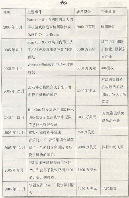 近幾年來,一些資本投資商將投資的重點(diǎn)放到了無線音樂、手機(jī)游戲和手機(jī)視訊等業(yè)務(wù)領(lǐng)域,逐步加大了對SP的投資力度(見表3)。進(jìn)入2005年以來,著眼于2.5G向3G的全面演進(jìn),風(fēng)險投資對SP的投資力度進(jìn)一步加大。以滾石移動為例,在2002年和2004年獲得兩輪風(fēng)險投資之后,滾石移動憑借在無線音樂領(lǐng)域取得的良好市場業(yè)績,又獲得了智基創(chuàng)投、華登國際、聯(lián)想投資等公司的投資,投資金額達(dá)3000萬美元。繼2004年10月獲得IDG投資以后,2005年12月7日,國內(nèi)著名的數(shù)字音樂門戶——A8音樂集團(tuán)獲得了包括IDG和Intel投資公司在內(nèi)的5家國際著名投資機(jī)構(gòu)的投資,投資金額達(dá)2000萬美元。同月,掌中無限則獲得了來自全球性風(fēng)險投資商BlueRun創(chuàng)投基金和IDG總額達(dá)上千萬美元的投資。