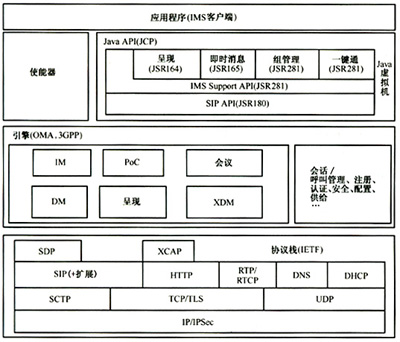 通過(guò)對(duì)于IMS客戶(hù)端相關(guān)規(guī)范的研究與分析,可以看出IETF提供了IMS客戶(hù)端所需要的協(xié)議部分,包括詳細(xì)的SIP信令消息交互,服務(wù)參數(shù)協(xié)商、媒體流的建立、XML文檔的交互等。3GPP和OMA提供了IMS客戶(hù)端所需要的服務(wù)引擎,與不同應(yīng)用服務(wù)器之間的交互方式以及如何接入到IMS網(wǎng)絡(luò)等。JCP提供了一整套IMS客戶(hù)端上Java應(yīng)用程序所需的標(biāo)準(zhǔn)Java應(yīng)用編程接口。由此可以總結(jié)歸納出IMS客戶(hù)端軟件架構(gòu)參考,具體參見(jiàn)圖2。