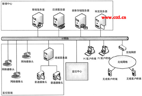圖中管理中心和監(jiān)控前端、監(jiān)控中心是視頻監(jiān)控系統(tǒng)的組成部分,無線網(wǎng)絡(luò)部分則是視頻監(jiān)控和其他系統(tǒng)互通的一個示例。當(dāng)然視頻監(jiān)控系統(tǒng)和其他業(yè)務(wù)網(wǎng)絡(luò)共同使用時,也可能會融為一體。