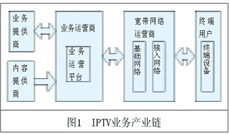 圖1所示的IPTV業(yè)務(wù)產(chǎn)業(yè)鏈中,主要角色包括內(nèi)容提供商/業(yè)務(wù)提供商(CP/SP)、業(yè)務(wù)運(yùn)營商、網(wǎng)絡(luò)運(yùn)營商和終端用戶。業(yè)務(wù)運(yùn)營商具有IPTV業(yè)務(wù)運(yùn)營資質(zhì),通過業(yè)務(wù)運(yùn)營平臺(tái)保證業(yè)務(wù)的提供和管理運(yùn)營,起著業(yè)務(wù)主導(dǎo)的作用;內(nèi)容提供商為業(yè)務(wù)運(yùn)營商提供內(nèi)容,業(yè)務(wù)提供商向業(yè)務(wù)運(yùn)營商提供增值業(yè)務(wù),使得業(yè)務(wù)中的內(nèi)容和種類豐富多彩以滿足用戶的不同需求,內(nèi)容提供商和業(yè)務(wù)提供商一般能根據(jù)用戶的使用情況獲取收入分成;網(wǎng)絡(luò)運(yùn)營商通過提供基礎(chǔ)網(wǎng)絡(luò)和接入網(wǎng)絡(luò)服務(wù)保證業(yè)務(wù)的傳送和質(zhì)量;終端用戶通過使用終端設(shè)備選擇和使用業(yè)務(wù),并支付相關(guān)費(fèi)用。
