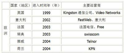 歐洲部分國家和地區(qū)進入IPTV市場的年份及主要運營商