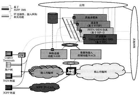 業(yè)務(wù)層包括下面的元素:PSTN/ISDN模擬子系統(tǒng)(PSS)即IMS核心子系統(tǒng)、PSTN/ISDN仿真子系統(tǒng)(PES)、其他多媒體子系統(tǒng)(如流媒體子系統(tǒng)、內(nèi)容多播子系統(tǒng)等)和應(yīng)用以及可以用于多個(gè)子系統(tǒng)的公共元素(如接入應(yīng)用、計(jì)費(fèi)功能、用戶(hù)屬性管理、安全管理和路由管理等);傳送層為用戶(hù)終端提供了基本的IP連接的能力,其中的網(wǎng)絡(luò)附屬子系統(tǒng)(NASS)和資源認(rèn)證控制子系統(tǒng)(RACS)屏蔽了IP層以下的接入網(wǎng)/核心網(wǎng)所使用的傳送技術(shù),給固網(wǎng)NGN用戶(hù)終端提供了IP的連續(xù)性。