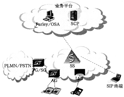 直接由SoftSwitch提供業(yè)務(wù),可提供基本電話(huà)業(yè)務(wù)、補(bǔ)充業(yè)務(wù)等;SoftSwitch具備SSP功能,通過(guò)SG與現(xiàn)網(wǎng)SCP互通,提供現(xiàn)有智能網(wǎng)業(yè)務(wù);SoftSwitch與應(yīng)用服務(wù)器之間通過(guò)SIP、H.323、Radius等協(xié)議互通;通過(guò)Parlay-GW/OSA-GW提供API接口,為第三方提供業(yè)務(wù)開(kāi)發(fā)平臺(tái)。