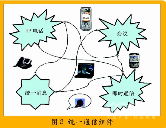 通信的終端可能是桌面電話、計(jì)算機(jī)、手機(jī)或者PDA。這4個(gè)部分之間存在緊密的聯(lián)系,比如說(shuō)電話語(yǔ)音可以轉(zhuǎn)換為統(tǒng)一消息;電話不可達(dá)時(shí),可以采用即時(shí)消息溝通或者小組成員可以使用多種方式參與到同一個(gè)會(huì)議中來(lái)等等。而所有這些聯(lián)系可能建立在統(tǒng)一的平臺(tái)之上: