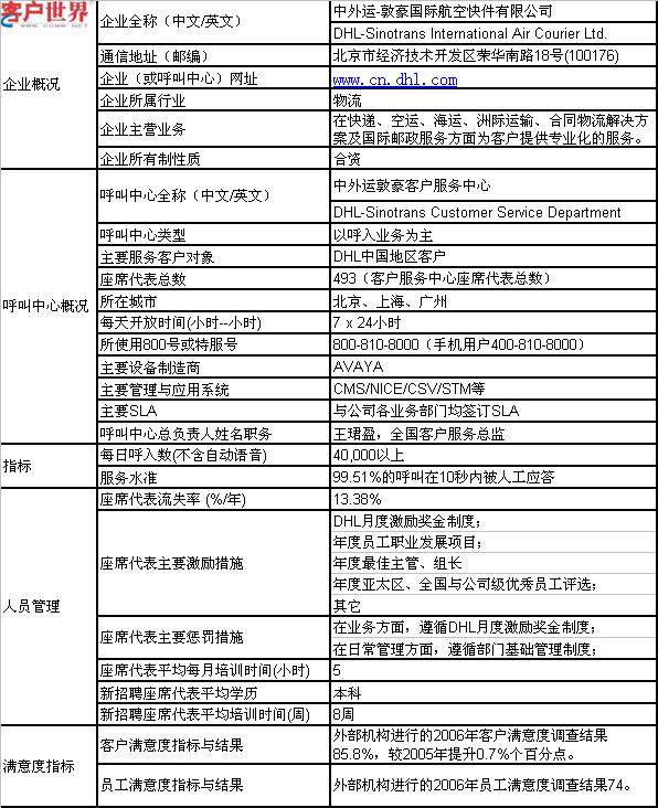 中外運(yùn)敦豪客戶服務(wù)中心現(xiàn)主要負(fù)責(zé)DHL中國(guó)客戶呼入業(yè)務(wù),公司在北京(北方區(qū))、上海(東方區(qū))、廣州(南方區(qū))分別設(shè)立區(qū)域級(jí)呼叫中心,采用全國(guó)免費(fèi)客戶服務(wù)熱線800-810-8000接入,并使用400-810-8000為手機(jī)用戶提供服務(wù)。除了電話,還開(kāi)通多種客戶溝通和聯(lián)絡(luò)渠道。在運(yùn)營(yíng)方面執(zhí)行嚴(yán)格的行業(yè)質(zhì)量標(biāo)準(zhǔn)體系,在預(yù)定取件、服務(wù)咨詢、跟蹤查詢、服務(wù)補(bǔ)救、重要客戶支持、電子商務(wù)受理過(guò)程中精益求精,為客戶提供全天候、一站式、個(gè)性化的信息、數(shù)據(jù)和客戶服務(wù),與客戶建立長(zhǎng)期的伙伴關(guān)系。