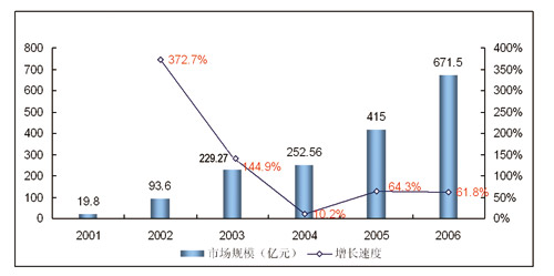 圖 2001-2006年中國移動(dòng)用戶增值業(yè)務(wù)市場(chǎng)規(guī)模