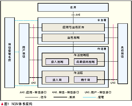NGN基于IP技術(shù),采用業(yè)務(wù)層和傳送層相互分離、應(yīng)用與業(yè)務(wù)控制相互分離、傳送控制與傳送相互分離的思想,能夠支持現(xiàn)有的各種接入技術(shù),提供話音、數(shù)據(jù)、視頻、流媒體等業(yè)務(wù),并且支持現(xiàn)有移動(dòng)網(wǎng)絡(luò)上的各種業(yè)務(wù),實(shí)現(xiàn)固定網(wǎng)絡(luò)和移動(dòng)網(wǎng)絡(luò)的融合,此外還能夠根據(jù)用戶的需要,保證用戶業(yè)務(wù)的服務(wù)質(zhì)量。NGN的網(wǎng)絡(luò)體系架構(gòu)如圖1所示,