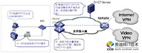 當網(wǎng)絡設備收到STB的DHCP請求報文時,需要在報文后添加OPTION82字段,此時有兩種模式進行DHCP+認證,一種是直接把DHCP報文送給DHCP服務器,由DHCP服務器根據(jù)OPT82字段來判斷該用戶是否為合法用戶,從而決定是否為其分配IP地址。另一種是DHCP報文先送到BRAS,由BRAS將OPT82字段放到RADIUS的一個子域里,通過RADIUS服務器來進行用戶合法性認證,若用戶合法,再由DHCP服務器分配IP地址。