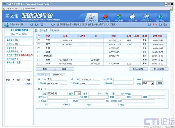電話本查詢功能允許員工從任何一臺電話機(企業(yè)內部或者外部電話都可以)查詢自己的電話本中聯系人信息。該功能對于出差在外管理人員,緊急時如果要查詢某客戶資料信息特別有用。例如,可以查詢客戶姓名、電話號碼、地址等等。