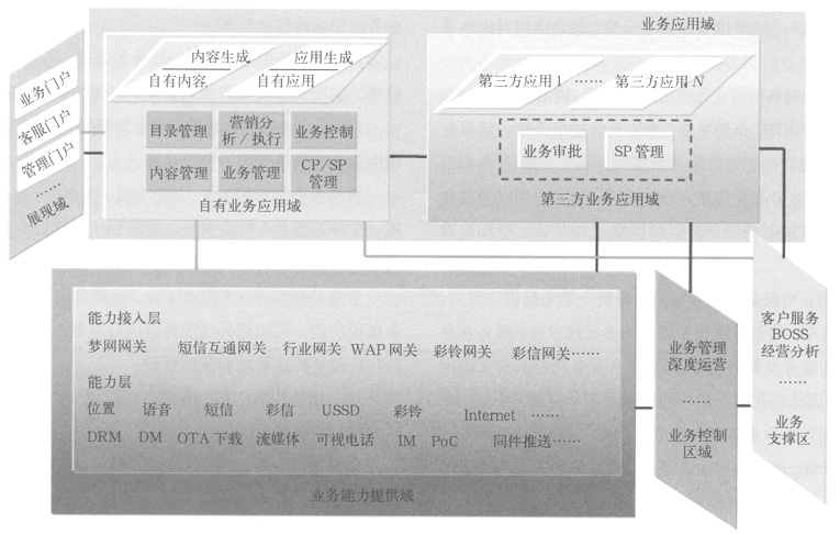 。1)業(yè)務(wù)能力系統(tǒng)。該部分包括具有實(shí)現(xiàn)各應(yīng)用功能的能力提供系統(tǒng),如短信、WAP等,可提供用戶使用業(yè)務(wù)功能的實(shí)現(xiàn)通道。