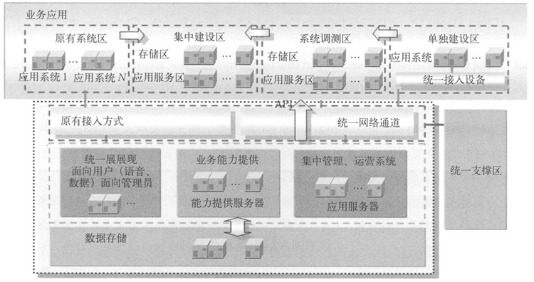 。5)應(yīng)用業(yè)務(wù)區(qū):統(tǒng)一搭建應(yīng)用硬件平臺,實(shí)現(xiàn)應(yīng)用業(yè)務(wù)區(qū)業(yè)務(wù)應(yīng)用及業(yè)務(wù)能力提供區(qū)接入通道類型的新增,均可直接在其硬件平臺上加載應(yīng)用軟件、提供服務(wù),調(diào)用現(xiàn)有資源實(shí)現(xiàn)。個別因為系統(tǒng)本身需求需要單獨(dú)建設(shè)、部署的系統(tǒng)則保留其單獨(dú)建設(shè)的方式。