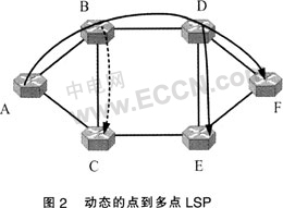 ....用圖2所示的6節(jié)點(diǎn)光網(wǎng)絡(luò)來(lái)闡述整個(gè)組播信令流程。與IP組播不同,點(diǎn)到多點(diǎn)LSP并不需要額外的組播組管理協(xié)議。這是因?yàn)槿~子節(jié)點(diǎn)的地址直接被包括在請(qǐng)求中,而不像IP組播中僅僅只是使用一個(gè)D類地址。所有的組播樹請(qǐng)求都將用一個(gè)三元組來(lái)表示{T,a,L},其中T是組播樹的標(biāo)識(shí)符,s是源節(jié)點(diǎn),L是組播樹的葉子集合。當(dāng)T等于O的時(shí)候意味著這是一個(gè)組播樹建立請(qǐng)求。例如,源節(jié)點(diǎn)A希望建立一個(gè)到葉子E和F的組播樹,那么這個(gè)請(qǐng)求就被表示為{0,A,{E,F(xiàn)}}。當(dāng)這顆樹被建立后,它將被分配一個(gè)全局唯一的標(biāo)識(shí)符,比如1。請(qǐng)求{1,A,{C1}}和{1,A,{F}}則分別意味著將葉子C嫁接到組播樹1和將葉子F從組播樹1中剪除。如果想刪除整棵樹,只需要將組播樹1的所有葉子都剪除即可,即{1,A,{C,E}}。