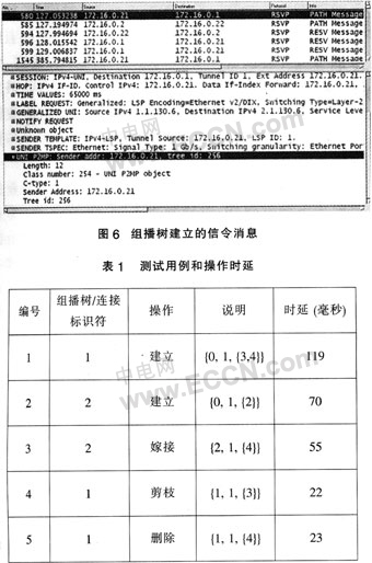1出發(fā)的組播樹和單播連接,結(jié)果如表1所列。圖6顯示了Ethereal捕獲的組播樹建立的信令消息。在解開的Path消息中,可以發(fā)現(xiàn)經(jīng)過(guò)擴(kuò)展的UNI組播對(duì)象。然后,對(duì)已存在的連接進(jìn)行了動(dòng)態(tài)的修改。在第三個(gè)測(cè)例中,一個(gè)葉子被添加到單播連接上并使其變?yōu)橐豢媒M播樹。在嫁接和剪枝的操作中,業(yè)務(wù)生成器在已建立的連接上沒(méi)有觀察到丟包的現(xiàn)象。