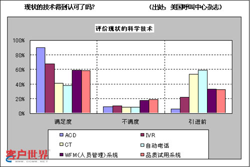 這是調(diào)查美國客服中心的管理者們?nèi)绾卧u價自己公司引進技術(shù)的統(tǒng)計表。雖然“滿意”并不意味著“相關(guān)技術(shù)被有效利用”。可是從調(diào)查結(jié)果來看,他們對技術(shù)的滿意度相當高,并且看起來都在有效利用相關(guān)技術(shù)。