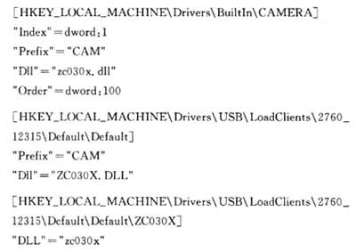 系統(tǒng)自動加載驅(qū)動程序時(shí),首先要將驅(qū)動程序復(fù)制到\WINDOWS文件夾下,然后向注冊表中寫入攝像頭的驅(qū)動信息: