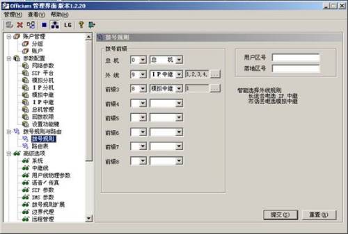 IP PBX 進行配置(如圖)。人機界面簡潔易懂,即便是不懂通訊的外行人,在看過說明書后也能輕松自如地使用。配置起來簡單,例如選擇外線撥號前綴號、做呼叫中心時的ACD輪循分機線路輪循、回撥等,僅僅選下數(shù)字點下提交,幾秒內(nèi)就可配置結(jié)束。