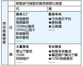 - 10086-12580信息服務(wù)。作為客戶(hù)服務(wù)中心的10086所提供的是典型的勞動(dòng)力密集型服務(wù),標(biāo)準(zhǔn)化和無(wú)差異是客戶(hù)服務(wù)提供的根本要求,而12580信息服務(wù)盡管仍然屬于勞動(dòng)力密集型服務(wù),但每一次信息服務(wù)都是獨(dú)特的,顧客的參與程度和服務(wù)的個(gè)性化都遠(yuǎn)遠(yuǎn)高于10086。
