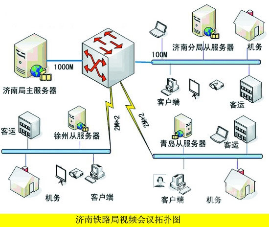 由于路局改革后組織結(jié)構(gòu)的特點(diǎn),決定了跨地域會(huì)議較多,如濟(jì)南和徐州、青島之間召開的部門級(jí)別的會(huì)議比較頻繁,加上三地之間的帶寬制約,本方案采用了主從服務(wù)器的系統(tǒng)架構(gòu),1主3從,主服務(wù)器設(shè)置在路局網(wǎng)絡(luò)中心,原來(lái)濟(jì)南分局位置設(shè)置1臺(tái)從服務(wù)器,負(fù)責(zé)濟(jì)南地區(qū)的內(nèi)部會(huì)議,以及與其他2地的遠(yuǎn)程會(huì)議,同樣徐州、青島也各設(shè)置1臺(tái)從服務(wù)器。
