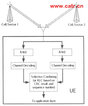 當(dāng)終端用戶移動到不同基站下的小區(qū)分界處時候,采用宏分集技術(shù)同時接收來自兩個基站的電視數(shù)據(jù)(見圖3)。在實現(xiàn)宏分集技術(shù)時,要求網(wǎng)絡(luò)側(cè)針對同一MBMS業(yè)務(wù)在兩小區(qū)間進行內(nèi)容同步和一定程度上的時間同步。