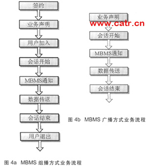 MBMS可應(yīng)用組播模式和廣播模式兩種業(yè)務(wù)模式。廣播模式接近于數(shù)字電視業(yè)務(wù),而組播模式專注和定位于群業(yè)務(wù)。組播模式提供了更好的計費特性,包括服務(wù)訂閱、接入和推出功能,需要用戶簽約相應(yīng)組播組,進行業(yè)務(wù)激活,并產(chǎn)生相應(yīng)的計費信息,而廣播業(yè)務(wù)不需要小區(qū)中所有用戶都制定該業(yè)務(wù)便可以獲得。由于組播和廣播模式在業(yè)務(wù)需求上存在不同,導(dǎo)致其業(yè)務(wù)流程也不同(見圖4a、圖4b)。
