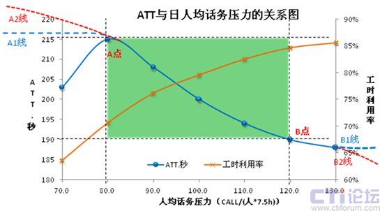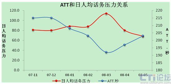 1. 人均話務壓力在80~120區(qū)間,ATT在215~190呈線性下降;